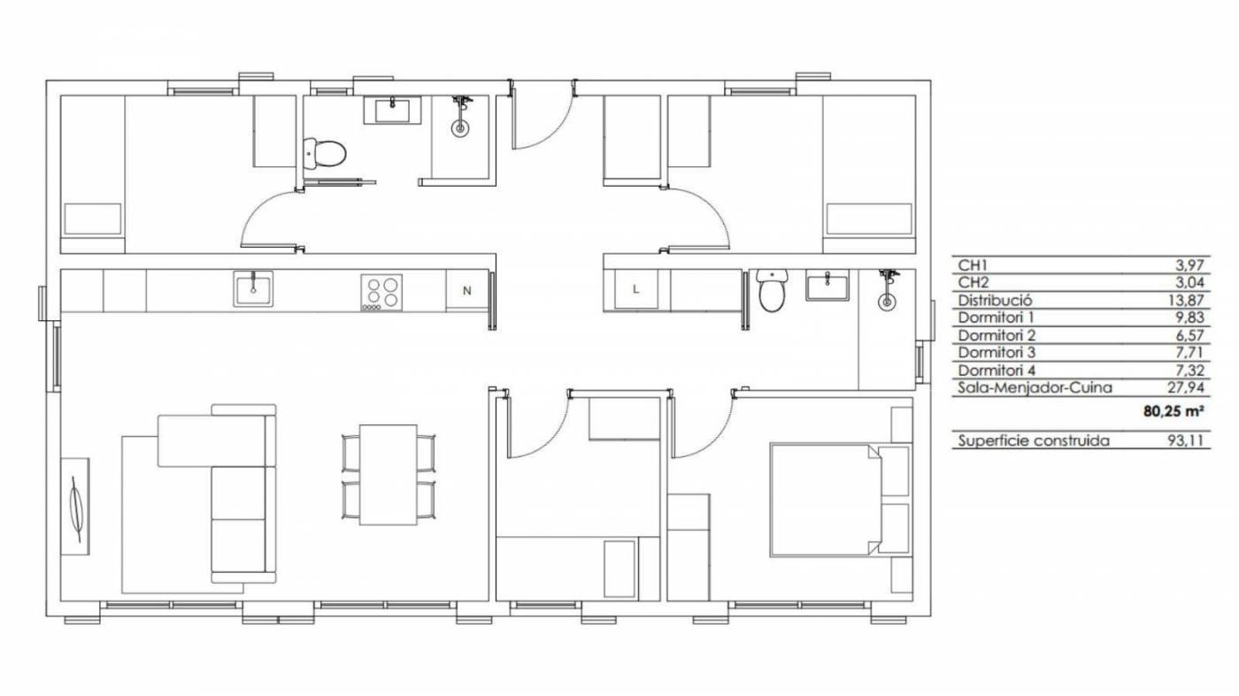 Habitatge sostenible 4 vents envoltats de natura!~~Et presentem una exclusiva casa unifamiliar d´obra nova construïda amb contenidors marítims reciclats, una solució innovadora i respectuosa amb el medi ambient que combina eficiència, disseny i confort. Ubicat en una parcel·la independent i envoltat de natura, aquest habitatge a 4 vents i molt ben orientat, aprofita al màxim la llum solar, destaca per la seva funcionalitat, eficiència energètica (certificació lletra A) i acabats d'alta qualitat.~~El sistema de construcció es realitza mitjançant autopromoció, cosa que permet al client tenir una participació directa en el procés i ajustar el projecte a les seves necessitats. El disseny és flexible i admet modificacions, adaptant-se als gustos i estil de vida de cada família.~~Amb una superfície construïda de 93 m², la casa es distribueix a un únic nivell que aprofita al màxim la llum natural i la connexió amb l'exterior. Disposa de:~• 4 dormitoris (un tipus suite)~• 2 banys complets~• Ampli espai obert de saló-menjador-cuina de 28 m² amb grans finestrals i accés directe al jardí~• Cuina moderna i equipada amb gran espai de treball~• Terreny completament pla i privat, es lliura tancat, amb porta d'accés per a vehicles i persones.~~Gràcies a l'excel·lent aïllament tèrmic i acústic, l'habitatge ofereix un confort superior a qualsevol estació. A més, el disseny interior aposta per materials naturals, una estètica càlida i minimalista i una excel·lent eficiència energètica.~~Un cop obtinguda la llicència d'obres, el termini de lliurament estimat és de 4 mesos.~~Una casa pensada per als que valoren la sostenibilitat, el disseny contemporani i el benestar a casa.