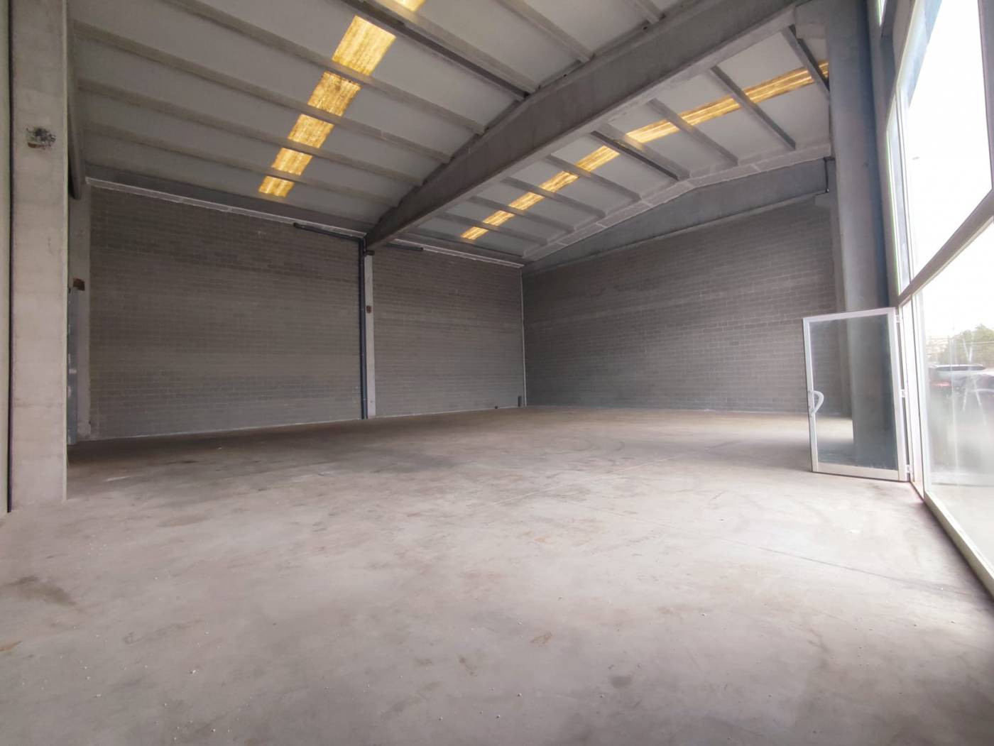 It has two pedestrian access doors and a door for merchandise.